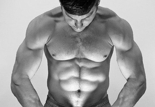 12 % жираВидно больше границ между мышцами, особенно на груди и спине, заметны очертания мышц брюшного пресса. Если встать так, чтобы свет падал сверху, при благоприятном расположении теней можно разглядеть намечающиеся кубики на животе. Например: