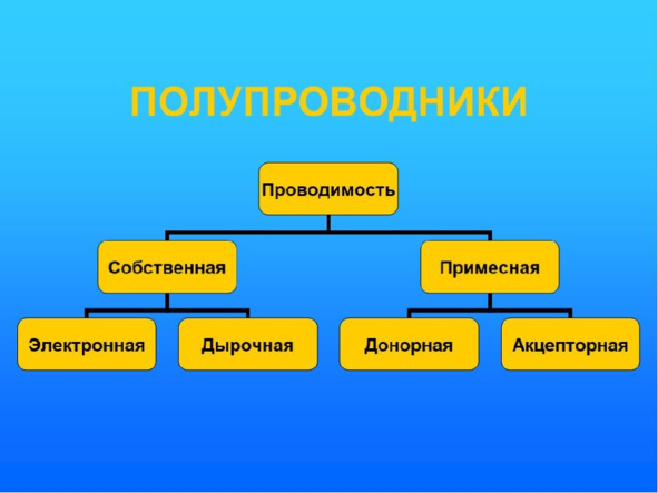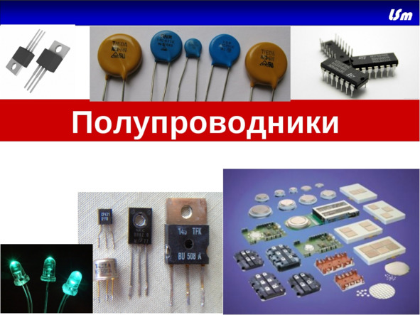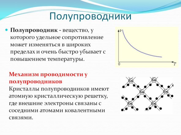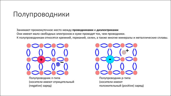 Полупроводниками являются кристаллические вещества, ширина запрещённой зоны которых составляет порядка электрон-вольта (эВ). Например, алмаз можно отнести к широкозонным полупроводникам (около 7 эВ), а арсенид индия – к узкозонным (0,35 эВ). К числу полупроводников относятся многие химические элементы (германий, кремний, селен, теллур, мышьяк и другие), огромное количество сплавов и химических соединений (арсенид галлия и др.).