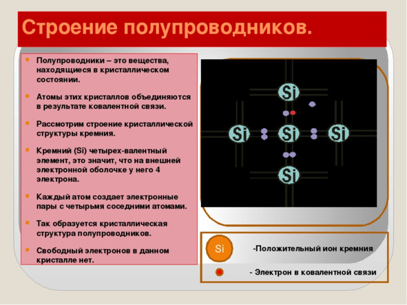 Полупроводники характеризуются как свойствами проводников, так и диэлектриков. В полупроводниковых кристаллах атомы устанавливают ковалентные связи (то есть, один электрон в кристалле кремния связан двумя атомами), электронам необходим уровень внутренней энергии для высвобождения из атома (1,76⋅10—19 Дж против 11,2⋅10—19 Дж, чем и характеризуется отличие между полупроводниками и диэлектриками). Эта энергия появляется в них при повышении температуры (например, при комнатной температуре уровень энергии теплового движения атомов равняется 0,04⋅10—19 Дж), и отдельные электроны получают энергию для отрыва от ядра. С ростом температуры число свободных электронов и дырок увеличивается, поэтому в полупроводнике, не содержащем примесей, удельное электрическое сопротивление уменьшается. Условно принято считать полупроводниками элементы с энергией связи электронов меньшей, чем 1,5—2 эВ. Электронно-дырочный механизм проводимости проявляется у собственных (то есть без примесей) полупроводников. Он называется собственной электрической проводимостью полупроводников.
