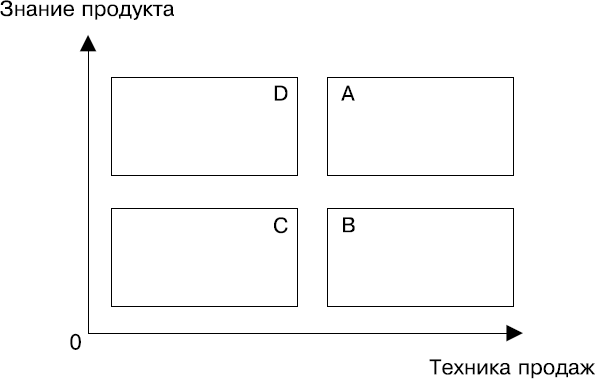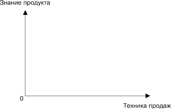 Вертикальная шкала у нас обозначает знание продукта, горизонтальная – владение техникой продаж.