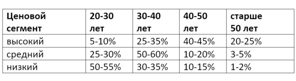 Здесь приведены общие показатели. На практике даже в пределах одного ценового сегмента возможны довольно значительные (до 10%) вариации распределения. Даже в рамках сетей, которые предоставляют своим клиентам одинаковые услуги по одинаковым ценам, имеет место индивидуальная половозрастная дифференциация клиентов в зависимости от места расположения клуба. Это еще раз указывает на условность ценовой сегментации рынка.