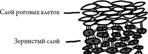 В зернистом слое клеточки достигают максимума своей продуктивности. Здесь они накапливают в себе различные полезные питательные вещества. После того как они выполнят все свои задачи и функции, они теряют свои черненькие ядрышки. С этого момента клеточка считается мертвой, безъядерной, и уже мертвые клетки попадают на поверхность кожи, в роговой слой. Здесь уже клетки мертвые, без ядра.