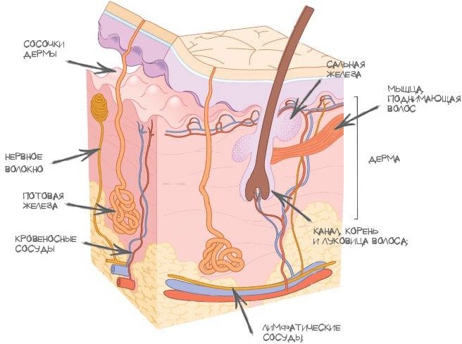Дерма у нас более толстый и плотный слой, здесь располагаются кровеносные сосуды, лимфатические сосуды, потовые железы, нервные волокна, корни волос, также сальные железы. В дерме также есть волокна коллагена, эластина, вода, липида и гиалоуроновая кислота.