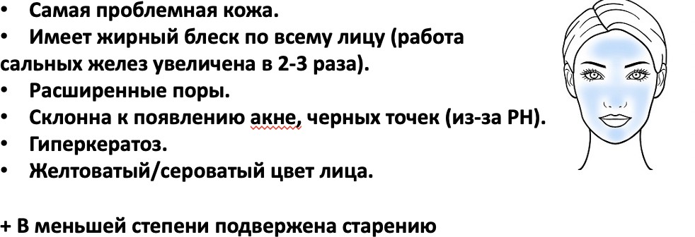 То есть, в этих местах сальные железы работают очень активно, поры расширены, и на этих зонах могут быть воспаления. А в области щек и скул кожа либо сухая, либо нормальная. Такая кожа также не подвержена преждевременному старению.
