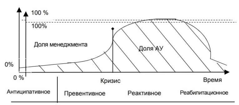 Рис. 3. Периоды антикризисного управления (АУ) и его доля в совокупности управленческих решений