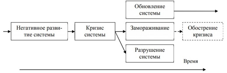 Советский экономист и философ конца XIX – начала XX века Богданов А.А. описывал природу кризиса как «момент, с которого они [комплексы] перестают быть тем, чем они были, отдельностями и образуют какую-то новую систему, с дальнейшими преобразованиями, возникновением связок»17.