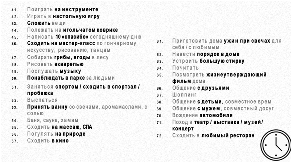 У меня, например, имеется список из более 100 дел и вещей, которые заряжают меня энергией (на короткий, средний или долгий срок в зависимости от типа активности) и дают восстановиться после физических или эмоциональных перегрузок.