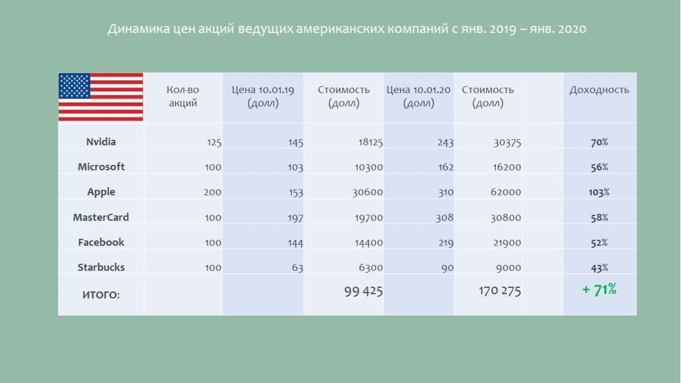 Если бы вы вложили 100 000 долларов в январе 2019 года и купили бы акции ведущих американских компаний, то всего лишь через один год в январе 2020 года у вас было бы уже на счету акции стоимостью 170 000 долларов, то есть доходность в 70%. А теперь скажите, какой банк может предложить депозит с такой высокой доходностью в долларах?
