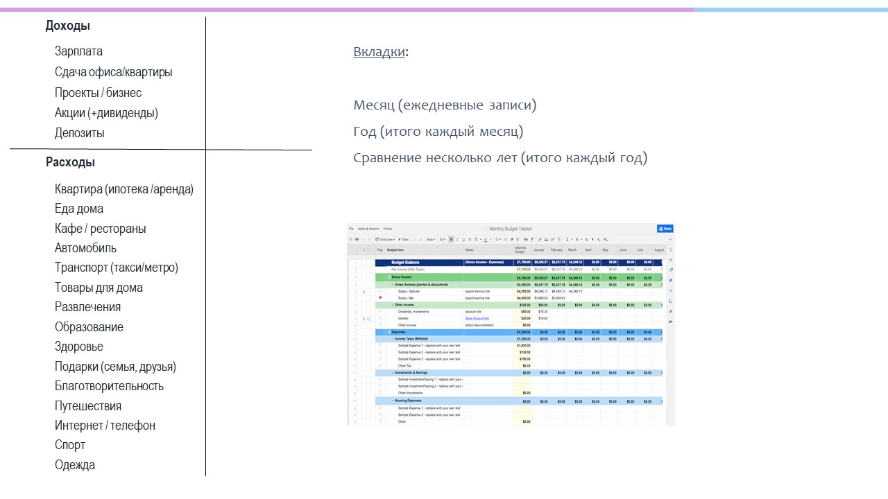 По доходам, например, у вас может быть зарплата с основной работы, проценты с банковского депозита и дивиденды по акциям. Расходные статьи могут включать такие категории как квартира (будь то просто квартплата или платежи по ипотеке или аренде), далее еда дома и еда в кафе и ресторанах, транспорт, имеется в виду общественный транспорт и такси, расходы на личный автомобиль, то есть бензин, страховка и т.д., развлечения, лекарства, обучение, подарки близким, товары для дома, путешествия и т.д.