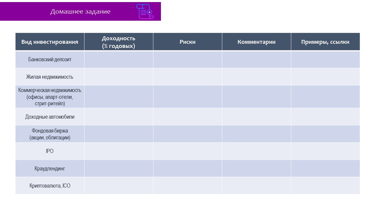 В одной из первых лекций, мы уже твердо решили откладывать как минимум 5-10% от своих доходов и записывать движения своих денежных средств. Теперь нам надо научиться их правильно инвестировать, чтобы получать дополнительную прибыль. Для этого для начала, заведите себе таблицу, в которой вы будете записывать все возможные виды инвестирования с их потенциальной доходностью, рисками и другими комментариями, которые вы посчитаете важными. Чем больше информации вы наберете, тем легче вам будет принимать решение куда вкладывать ваши свободные средства.