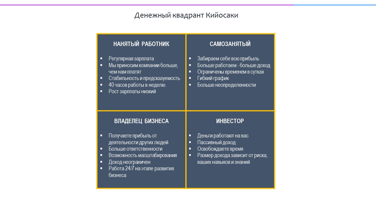 Но основная идея Кийосаки состоит в том, чтобы вы смогли понять, что существуют разные вида заработка, а не только работа на компанию, в которой вы сильно ограничены. И идеальным по мнению автора является цель достижение пассивного дохода, где вы не меняете свое время и навыки на деньги, а где сами деньги работают на вас.