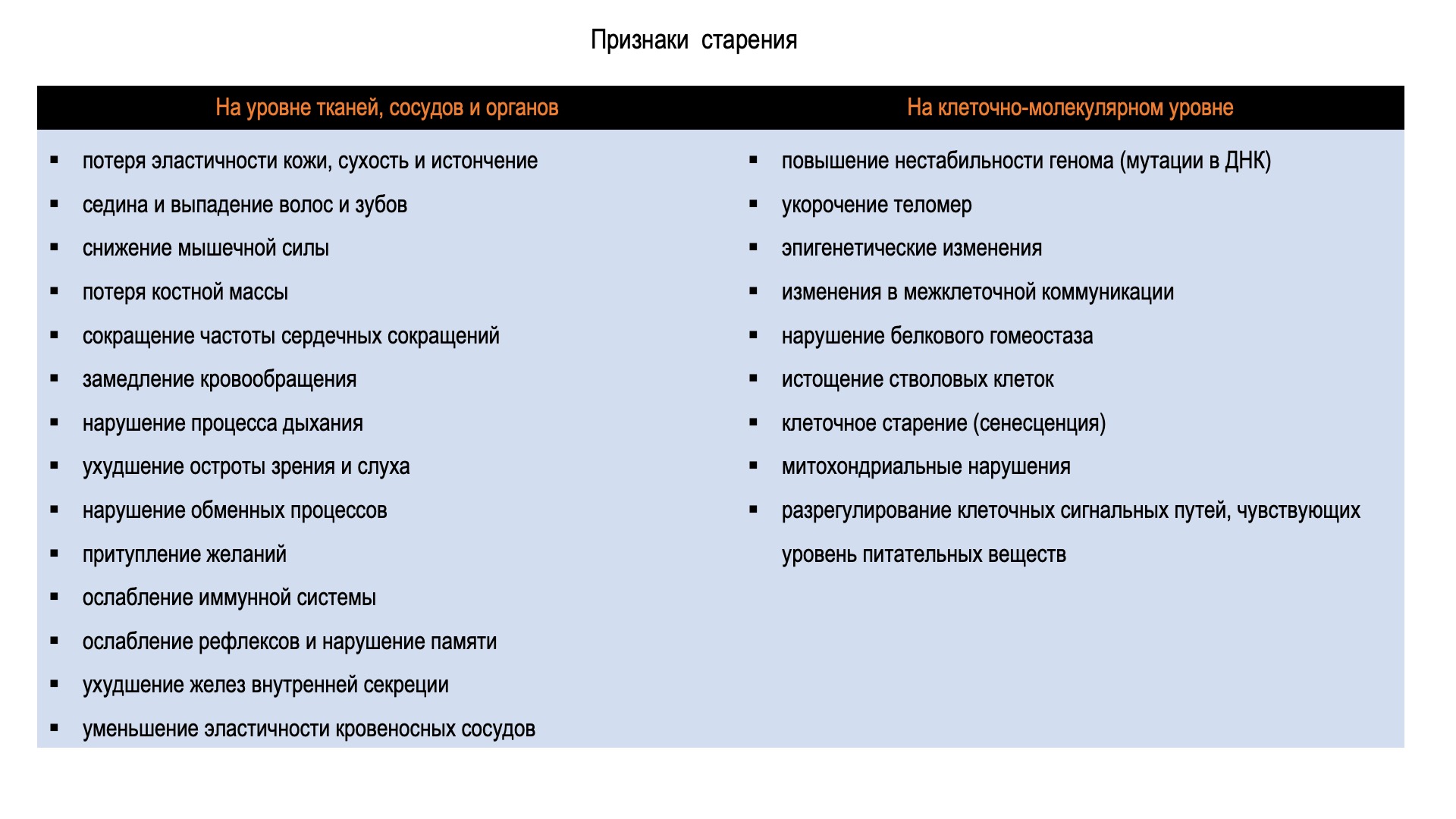 Признаки старения на макроуровне и клеточно-молекулярном уровне