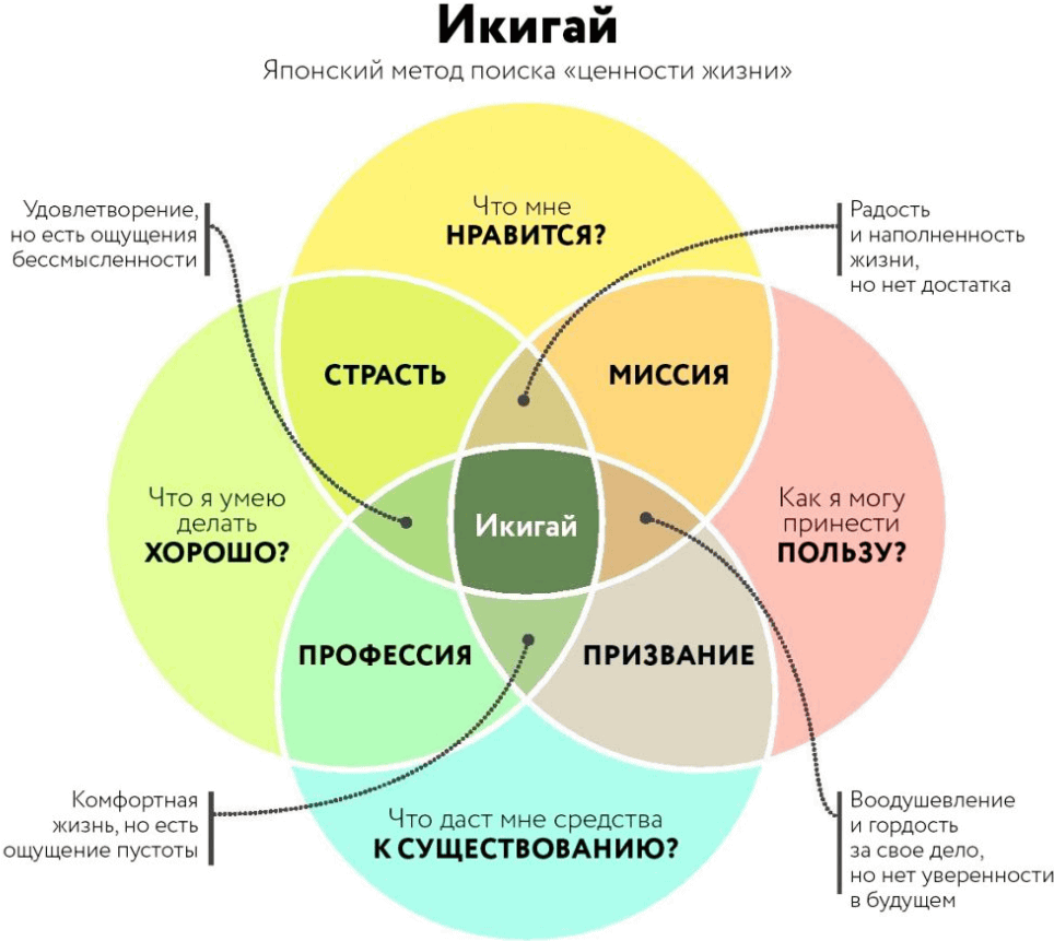 И в этом нам поможет такое понятие, как «Икигай». Оно происходит от японского, и состоит из двух слов: «ики» (жить) и «гай» (причина). И поэтому часто на русский язык икигай переводят как «смысл жизни». А более продвинутые толкователи этого термина объясняют его как «то, ради чего хочется вставать по утрам». Если вы уже знаете ответ на этот вопрос, то значит, вы нашли свой икигай.