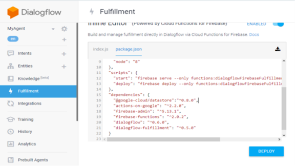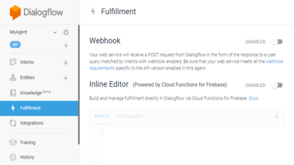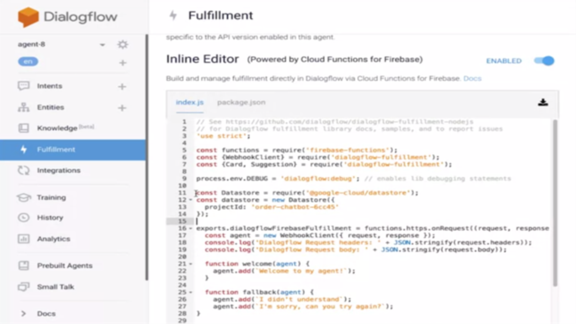 Здесь мы будем использовать встроенный редактор DialogFlow для написания кода.