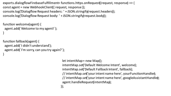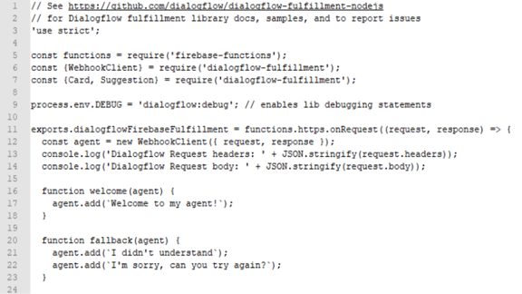 И здесь у нас есть основная функция dialogflowFirebaseFulfillment, где у нас есть функция для приветствия агента, и у нас есть функция для агента, который ничего не понимает.