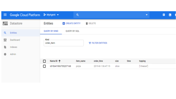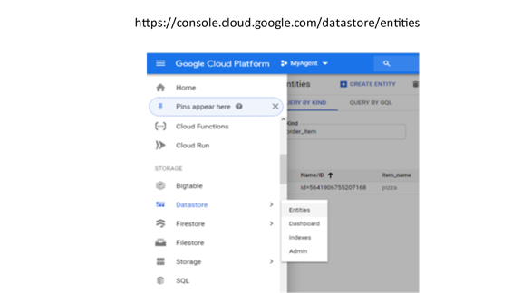 Чтобы проверить, сохранился ли заказ, откроем Google проект и в боковой панели выберем Datastore – Entites.