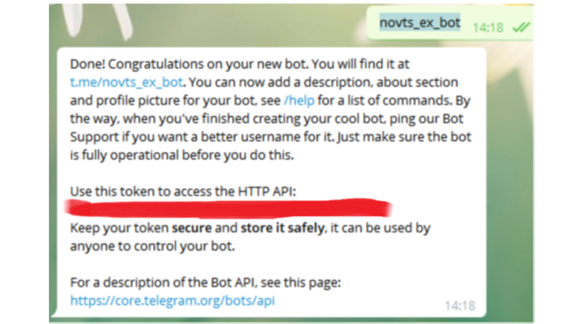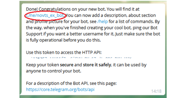 Здесь нажмем ссылку /newbot и введем имя бота ex_bot.