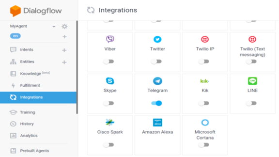 Dialogflow позволяет интегрировать вашего чат-бота с различными платформами.