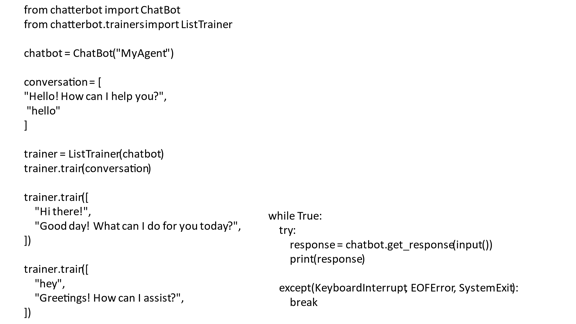 Класс тренера ListTrainer позволяет обучить чат-бота, используя список строк, где список представляет собой разговор пользователя с чат-ботом.