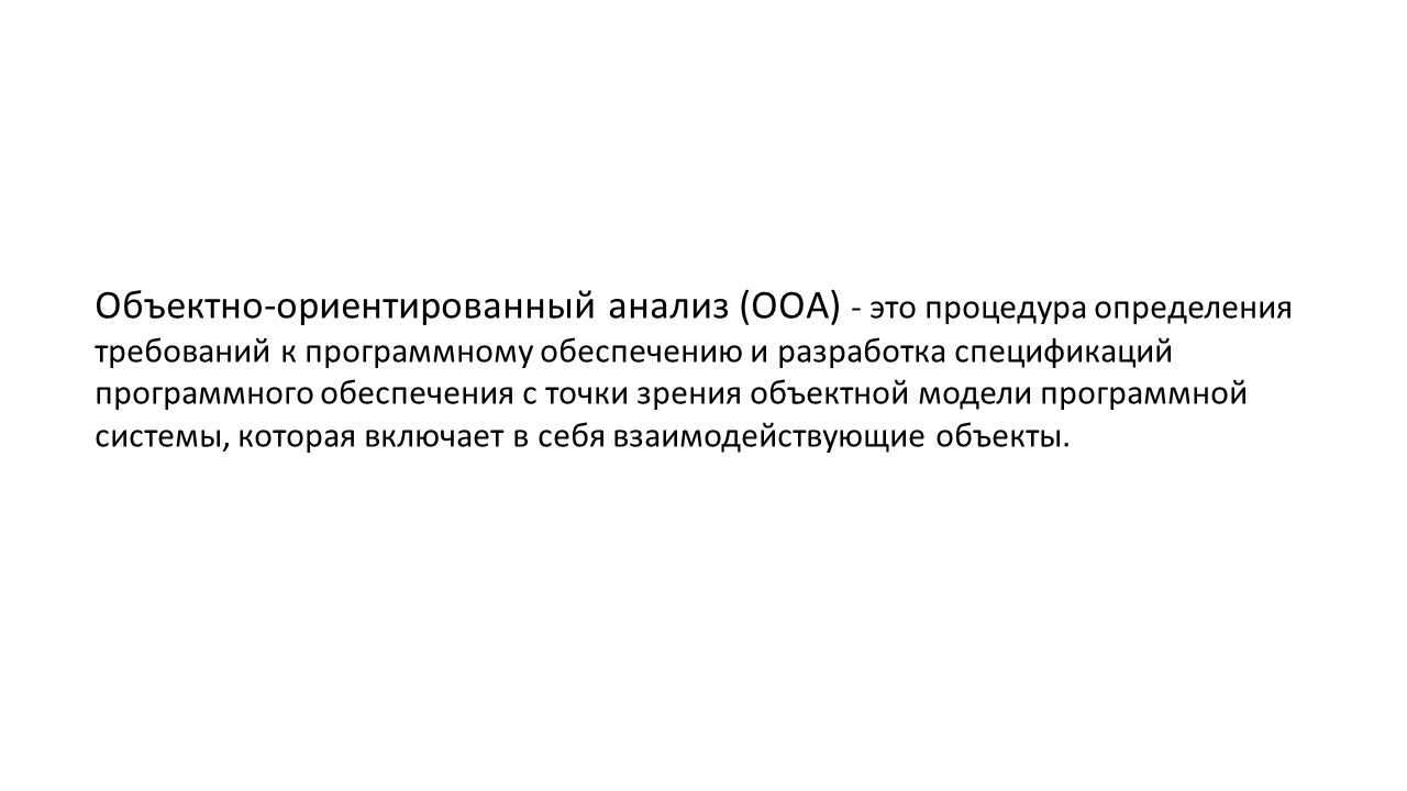 Объектно-ориентированный анализ (OOA) – это процедура определения требований к программному обеспечению и разработка спецификаций программного обеспечения с точки зрения объектной модели программной системы, которая включает в себя взаимодействующие объекты.