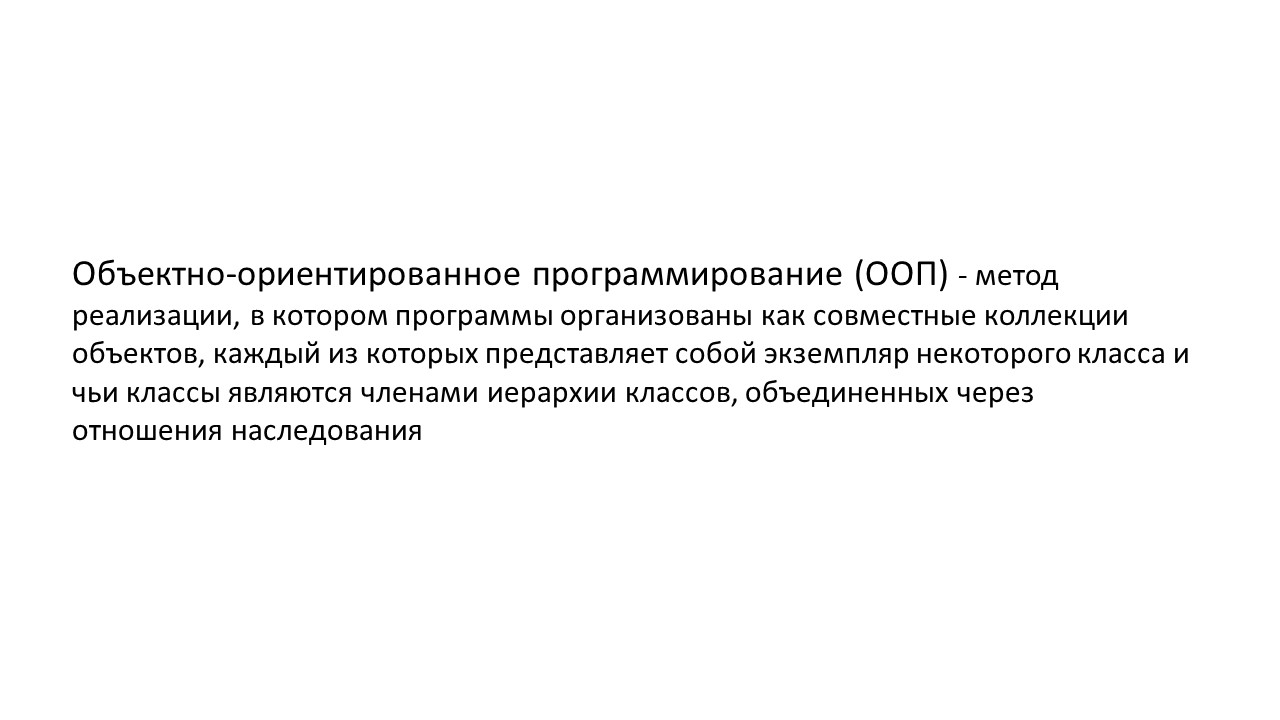 И наконец появилось объектно-ориентированное программирование – методология программирования, основанная на представлении программы в виде совокупности объектов, каждый из которых является экземпляром определённого класса, а классы образуют иерархию наследования.