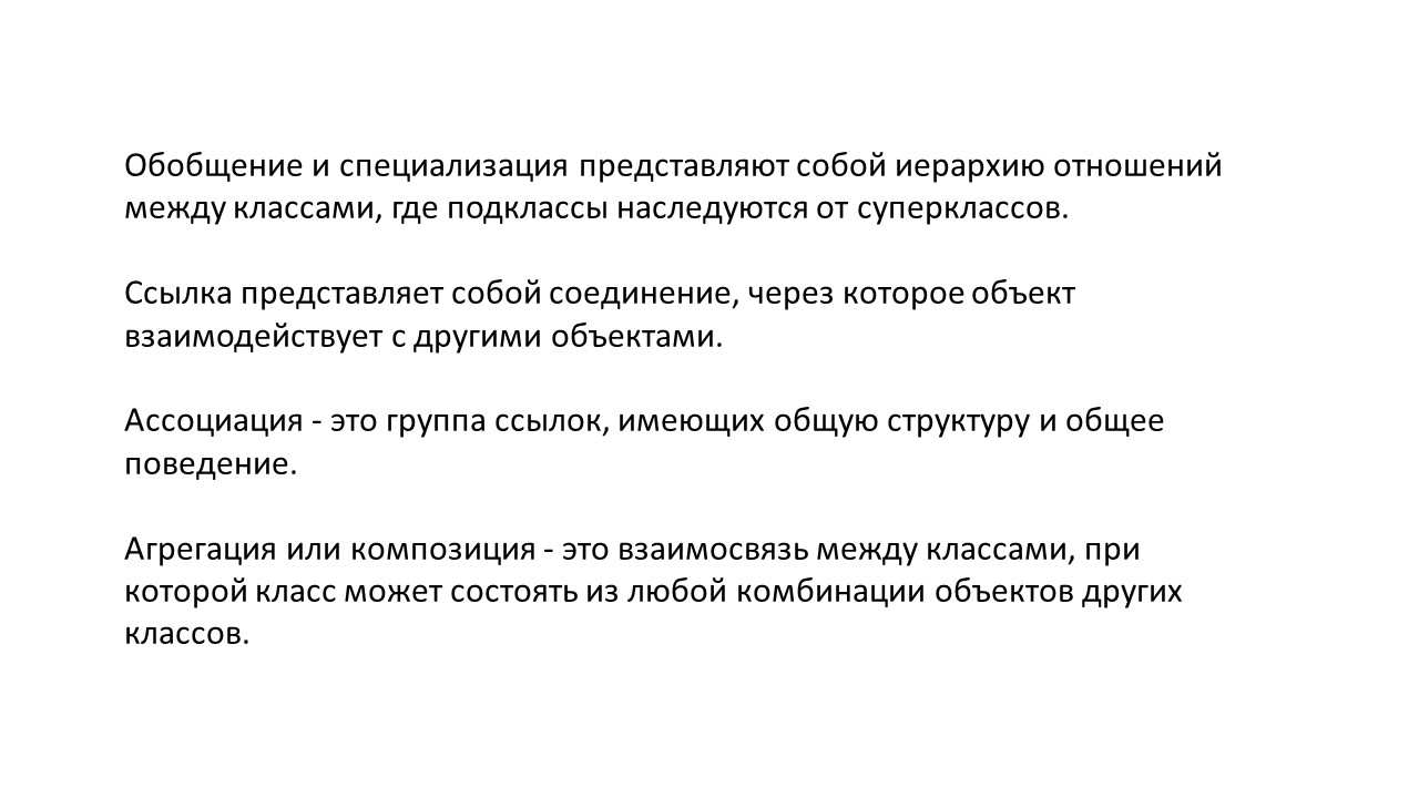 В процессе обобщения общие характеристики классов объединяются для формирования класса на более высоком уровне иерархии, т. е. подклассы объединяются для формирования обобщенного суперкласса.