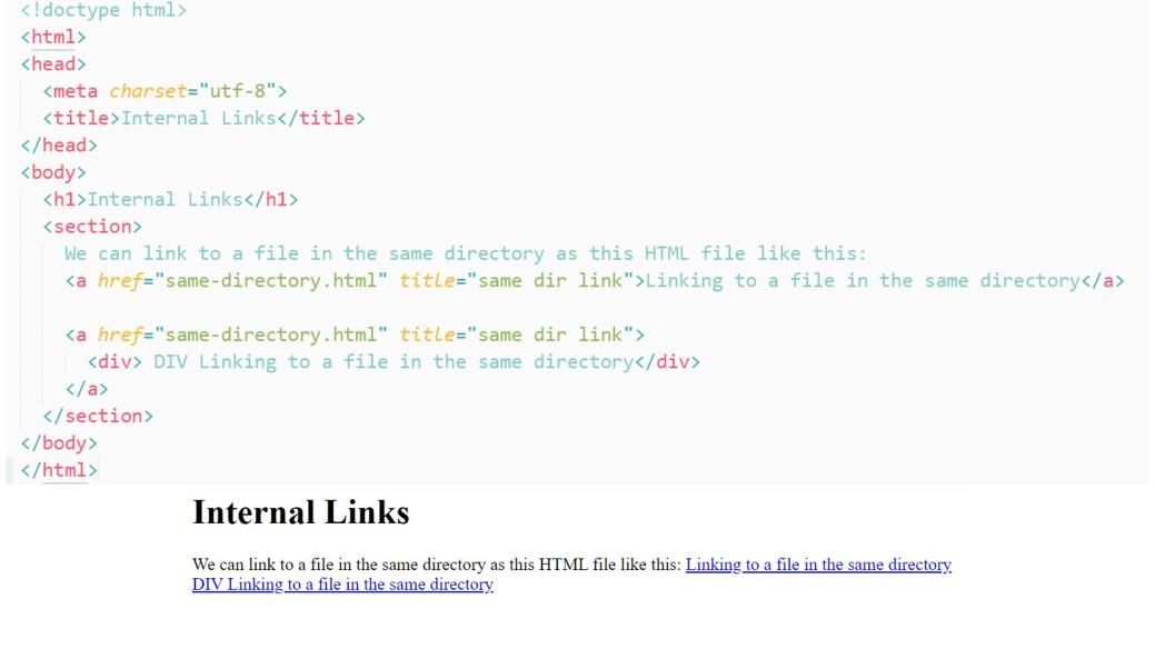 Таким образом, первая ссылка является встроенным тегом, так как она не инициирует переход на новую строку. Но во втором случае, мы окружаем блочный тег div тегом a.