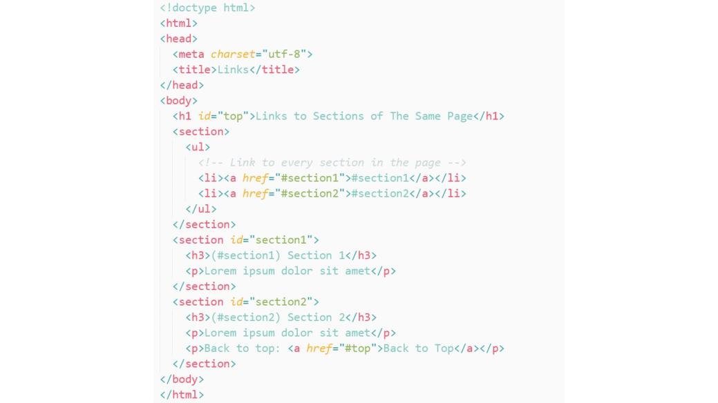 Такая ссылка имеет специфический формат атрибута href. Здесь есть символ #, за которым следует идентификатор фрагмента, как в этом примере section1, section2.