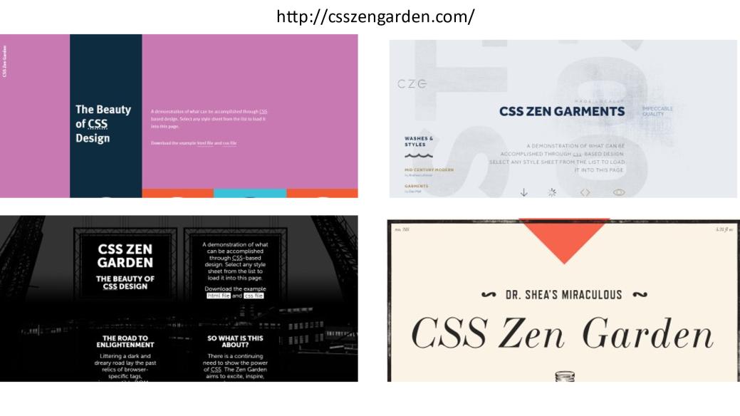В качестве примера можно посмотреть сайт csszengarden.com, где один и тот же HTML файл с помощью CSS выглядит фантастически по-разному.