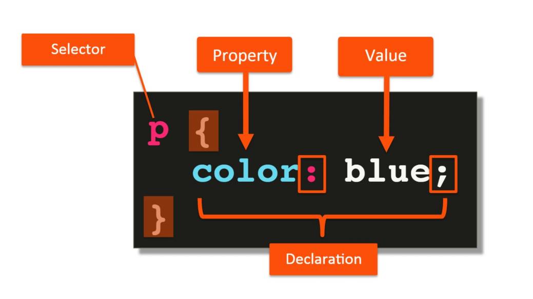 Как мы уже говорили, правило CSS состоит из селектора, за которым следуют открывающие и закрывающие фигурные скобки с объявлениями CSS, состоящими из двух частей, свойства и значения.