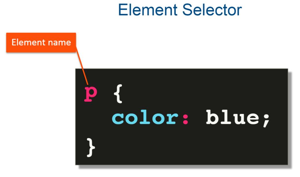 Первый тип селектора – элемент – это просто указание имени элемента. Например, в этом случае селектор p говорит о том, что текст каждого абзаца в нашем HTML-документе должен быть синего цвета.