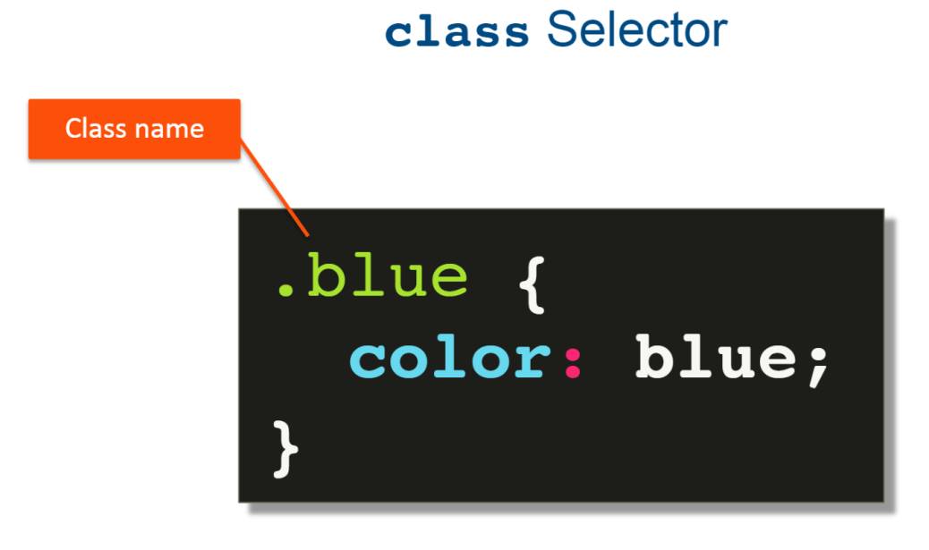 Далее идет селектор класса, который указывается точкой и именем класса. В этом случае мы создаем класс blue CSS, который будет окрашивать синим цветом.