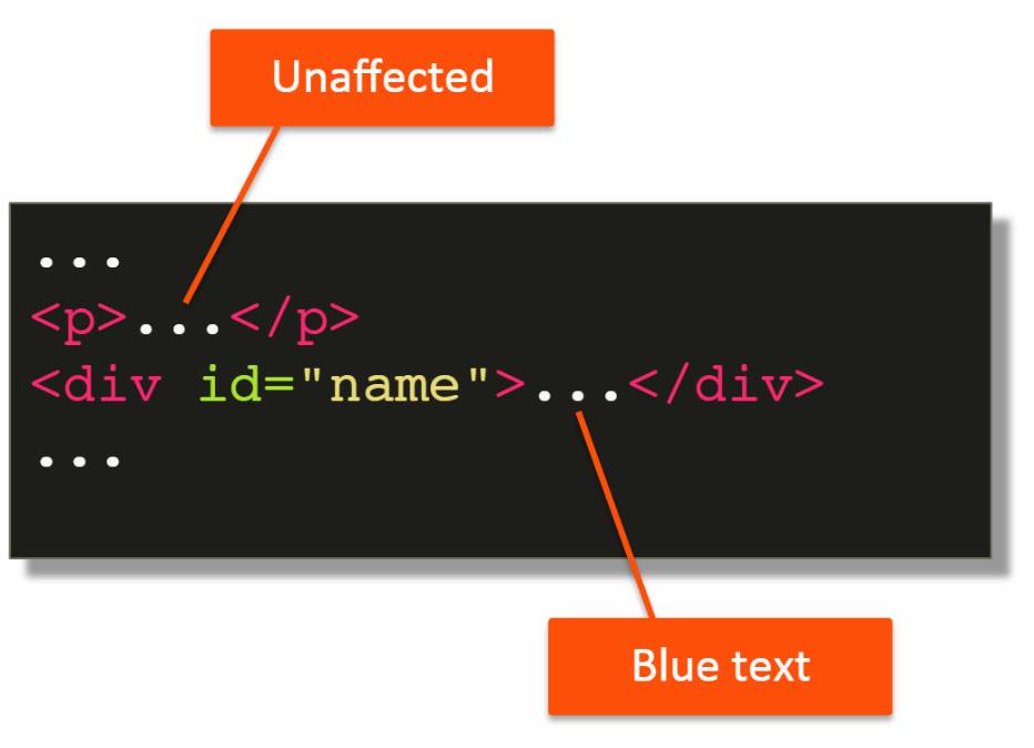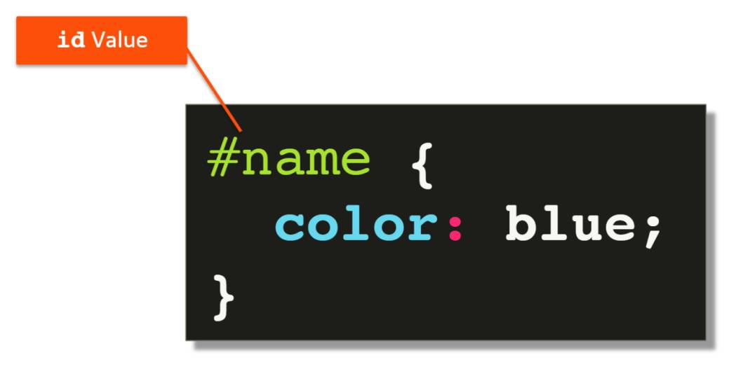 Так, например, если у вас есть элемент div с id="name", а затем вы указываете правило CSS с помощью селектора #name, объявления CSS будут применяться к содержимому элемента div с его значением id name.