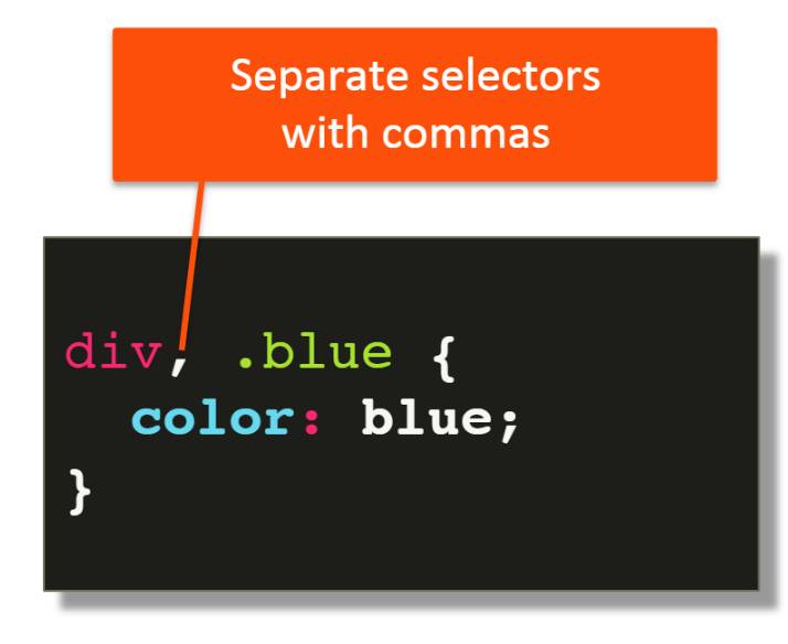 Здесь у нас есть два селектора, сгруппированные вместе, div и также селектор класса blue, так как они оба используют одно и то же объявление CSS.