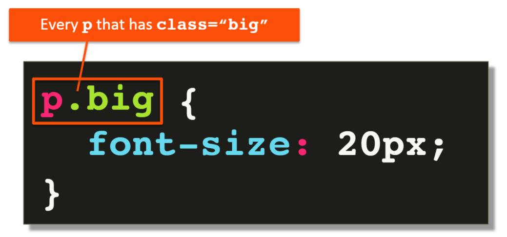 Здесь у нас есть селектор элемента p, за которым сразу без пробелов следует точка, которая является селектором класса. И это говорит о том, что мы хотим выделить каждый элемент p, который имеет атрибут класса со значением big.