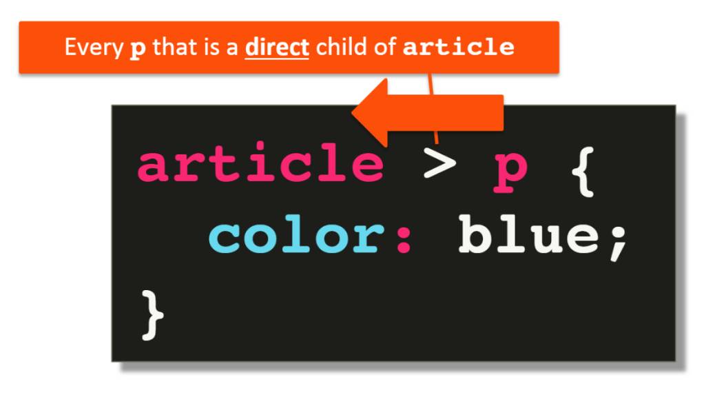 И в этом случае мы выделяем каждый элемент p, который является прямым дочерним элементом элемента article. Таким образом, в этом примере элемент p, который является прямым дочерним элементом элемента article, получит стиль синего цвета, в отличие от обычного элемента p.