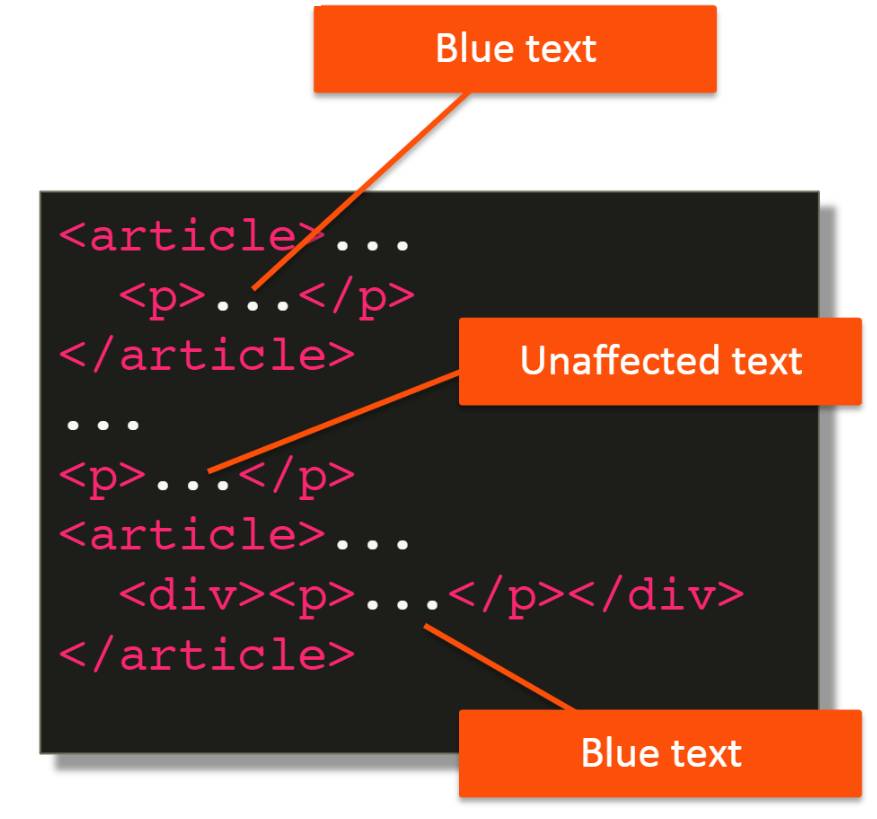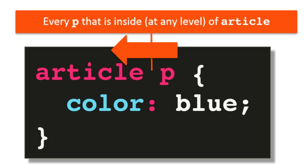 В этом случае мы выделяем каждый элемент p, который находится внутри элемента article на любом уровне, что означает, что даже если это не прямой дочерний элемент, даже если он глубоко внутри, до тех пор, пока один из его родителей является элементом article, это правило будет применяться.