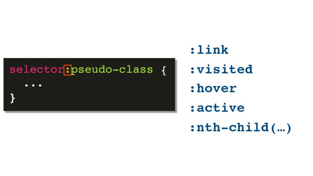 Селектор псевдокласса определяется с помощью указания некоторого селектора с двоеточием и предопределенным именем псевдокласса. И существует множество селекторов псевдоклассов.