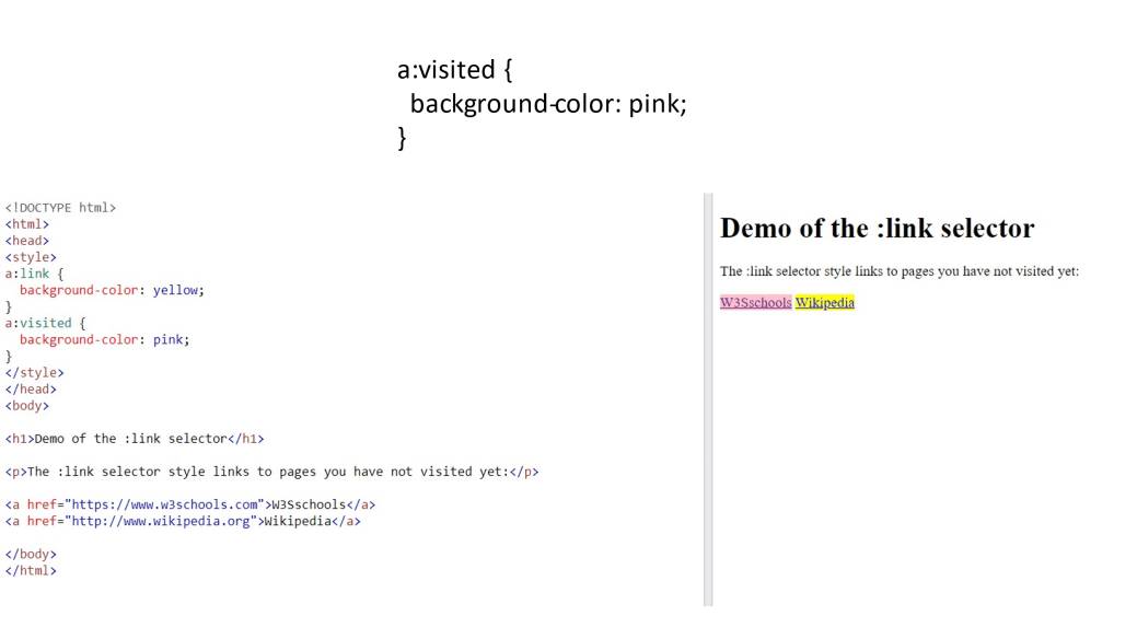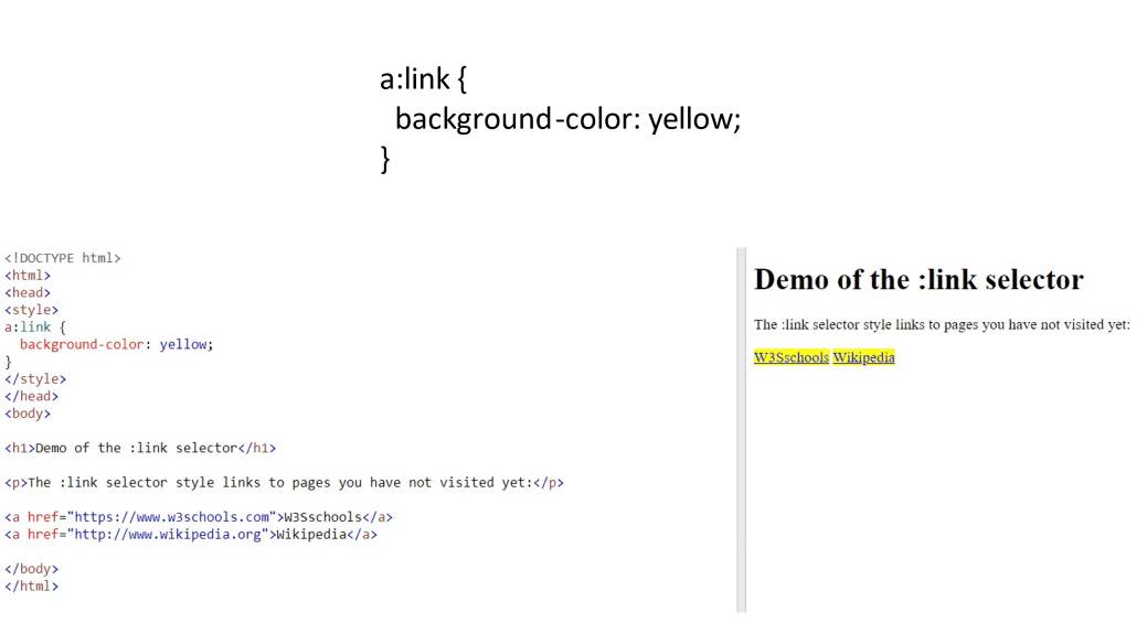 Например, селектор ссылок «:link» стилизует не посещенные ссылки. Здесь мы окрашиваем не посещенную ссылку в желтый цвет.