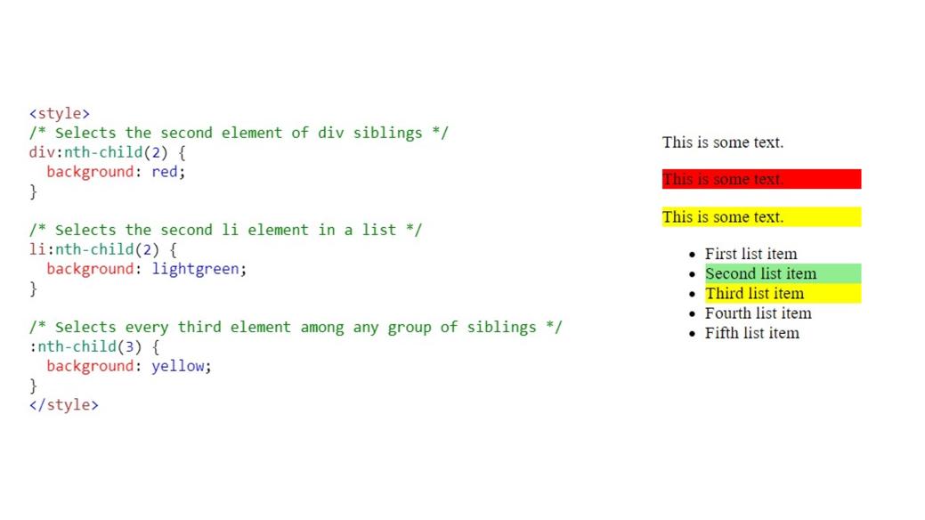 В этом примере, элемент «This is some text.» в первом теге div никак не стилизован, далее такой же элемент во втором теге div выделен красным цветом. В списке содержимое второго элемента выделено зеленым цветом, и содержимое каждого третьего элемента выделено желтым цветом.