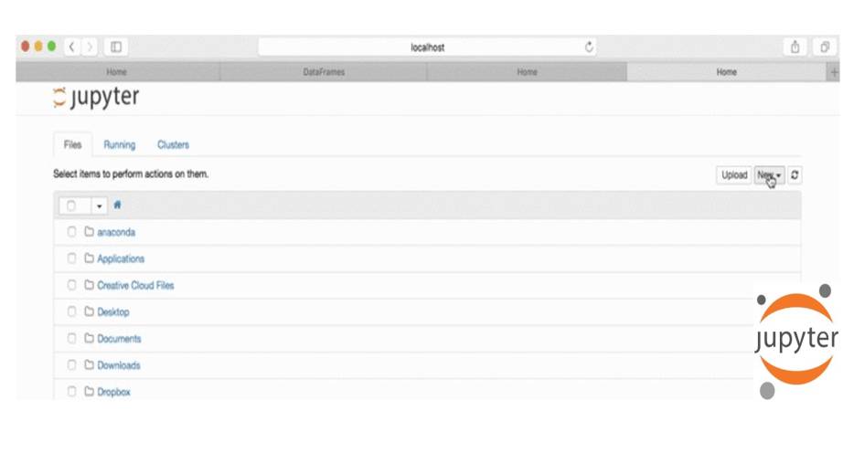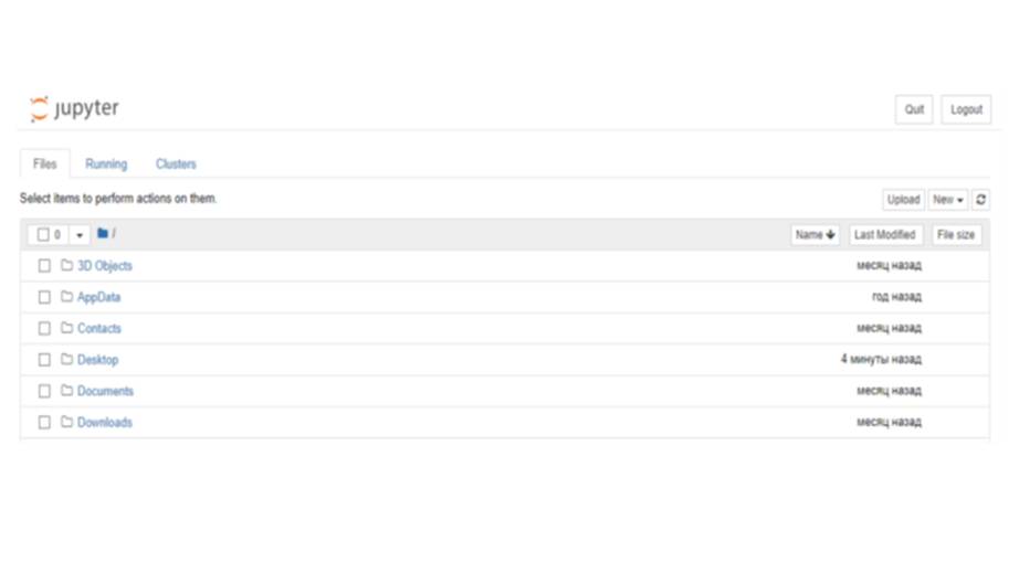 Во вкладке Files веб страницы Jupyter показываются все ваши файлы, во вкладке Running показываются все процессы ноутбуков, а третья вкладка Clusters предоставляется параллельной вычислительной средой IPython.