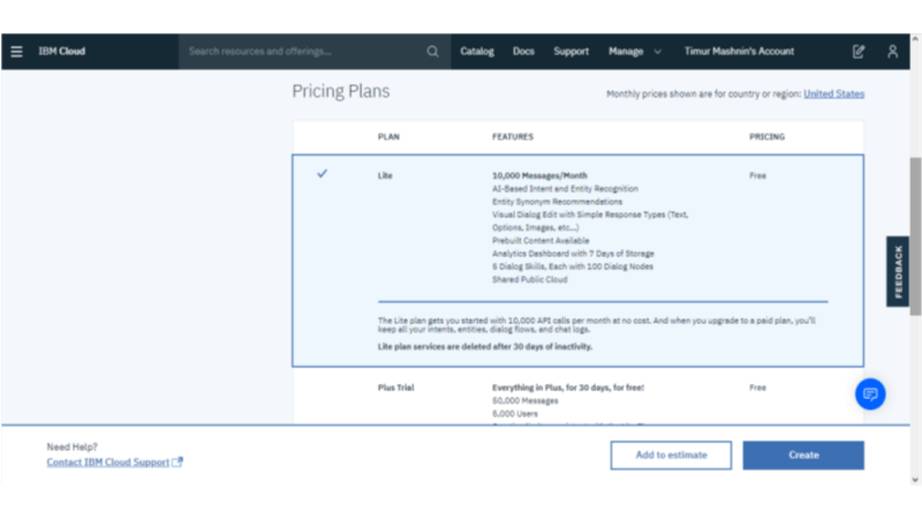 Далее выберете план Lite, и нажмите кнопку «Создать» внизу, чтобы создать свой экземпляр сервиса.