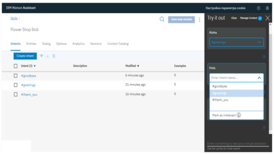 Если Уотсон неправильно классифицировал пример, нажмите на кнопку рядом с введенной фразой, чтобы назначить ей намерение.