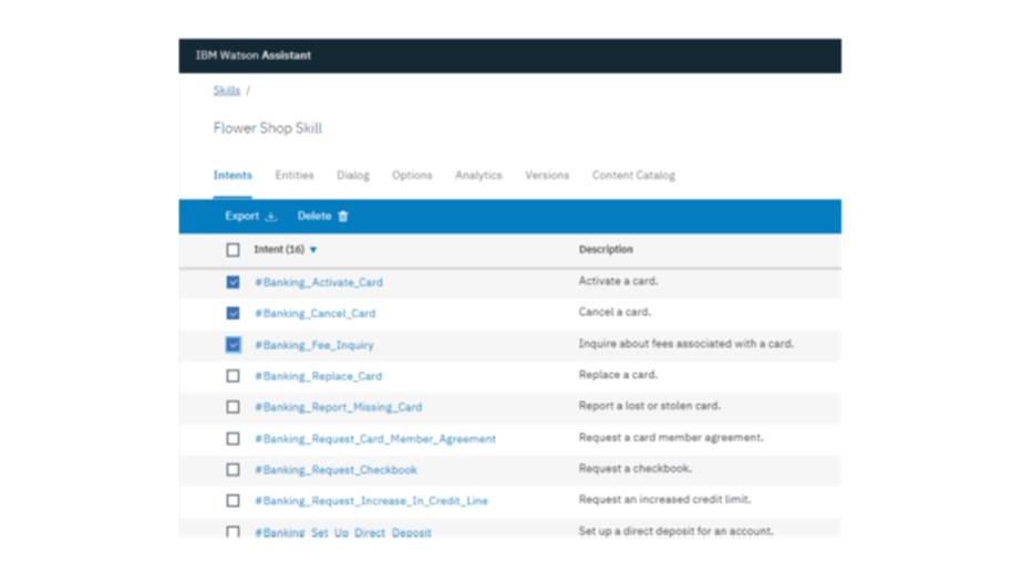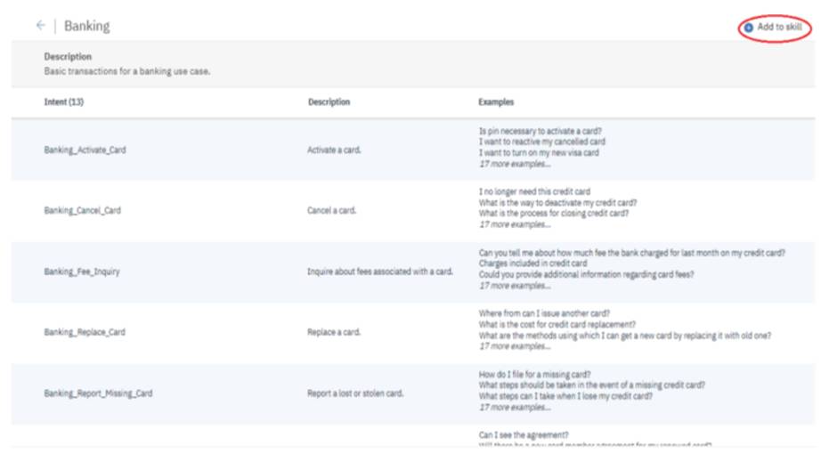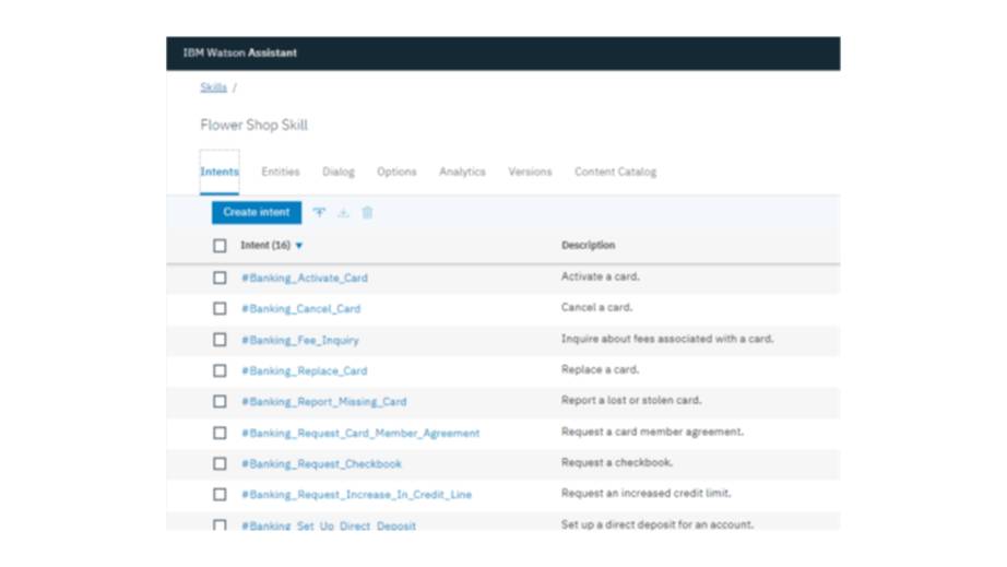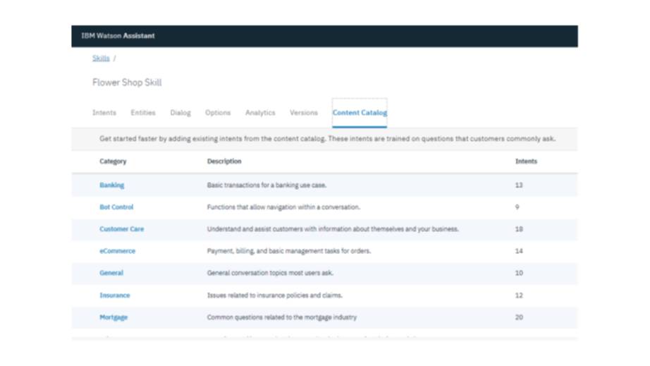 И Watson Assistant также поставляется с Каталогом контента, который предоставляет коллекции намерений, относящихся к различным отраслям, таким как банковское дело, страхование и электронная коммерция.