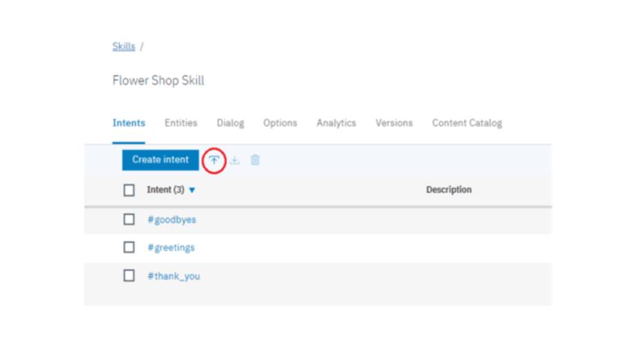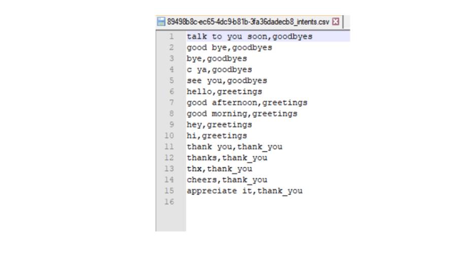 И примеры намерений можно вводить вручную в Watson Assistant, но их также можно импортировать из файлов CSV.