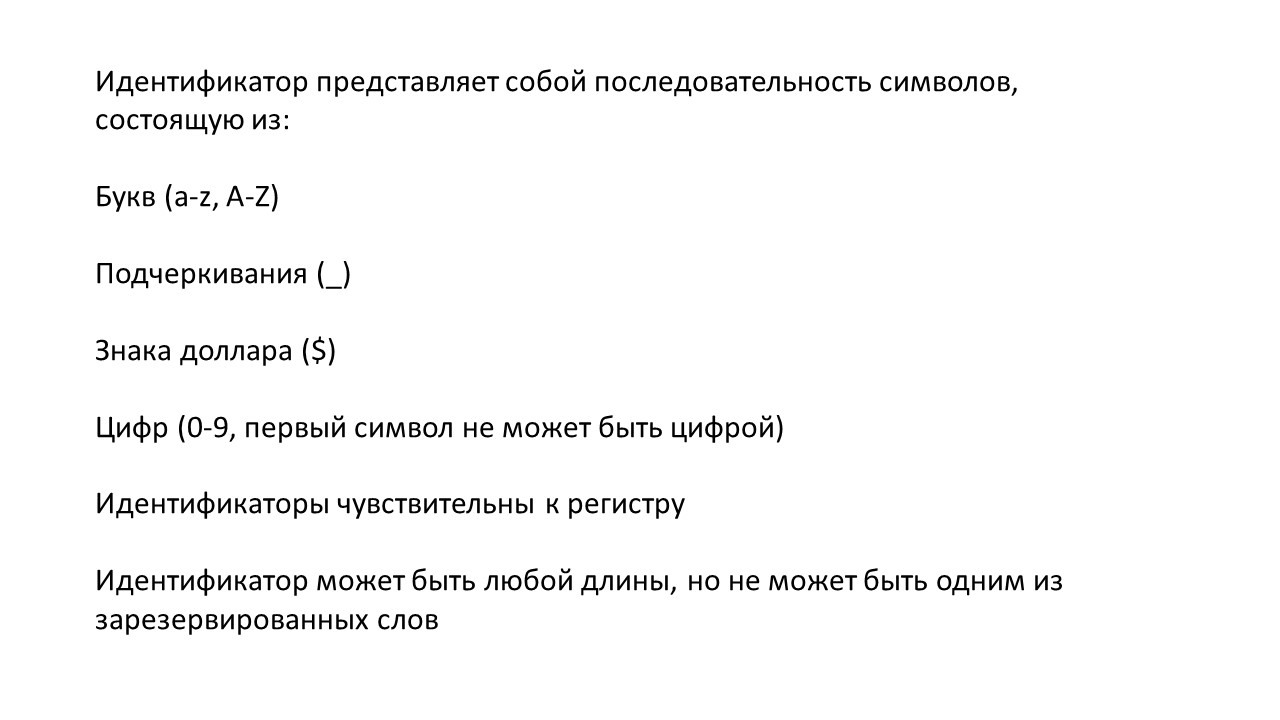 Таким образом, еще одно правило в том, что зарезервированные слова не могут быть использованы в качестве идентификатора.