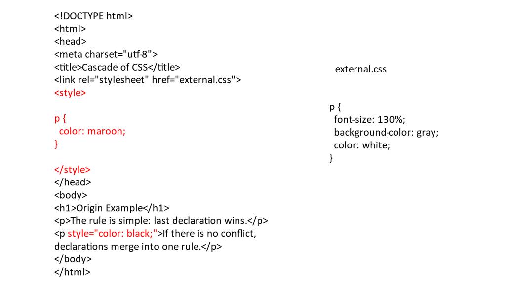 Когда два CSS объявления конфликтуют, другими словами, они определяют по-разному одно и то же свойство для одного и того же элемента, срабатывает правило приоритета происхождения.