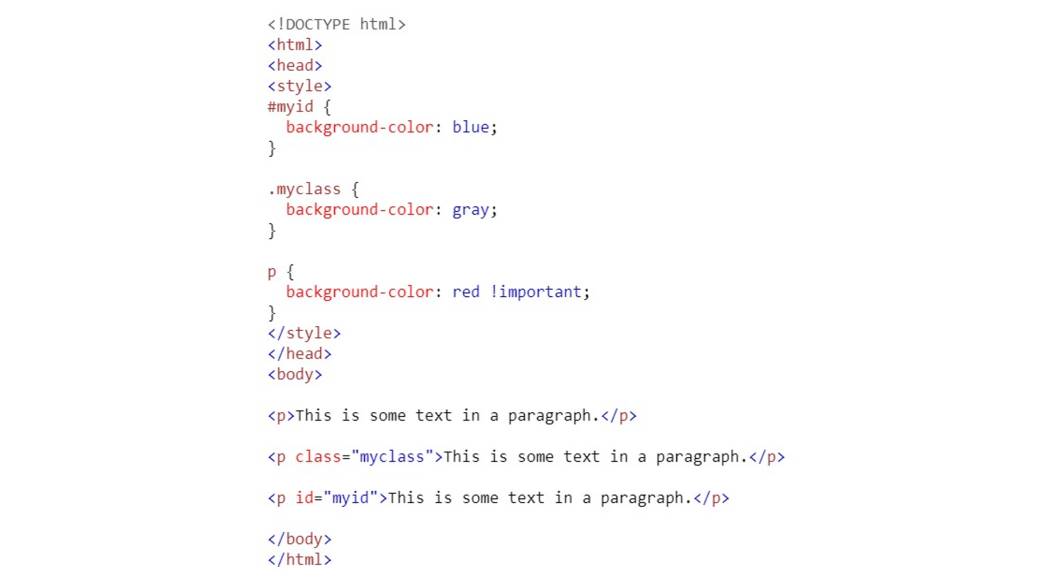 В этом примере все три абзаца получат красный цвет фона, хотя селектор идентификатора и селектор класса имеют более высокую специфичность. Потому что правило «!important» переопределяет свойство background-color в обоих случаях.