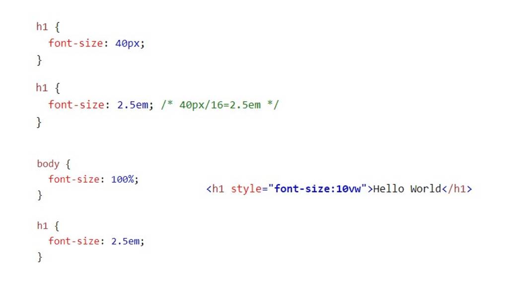 И наконец размер текста можно задать с помощью единицы vw, что означает «ширину области просмотра» viewport . Viewport – это размер окна браузера и 1vw = 1% ширины области просмотра. Если окно просмотра имеет ширину 50 см, 1vw составляет 0,5 см.