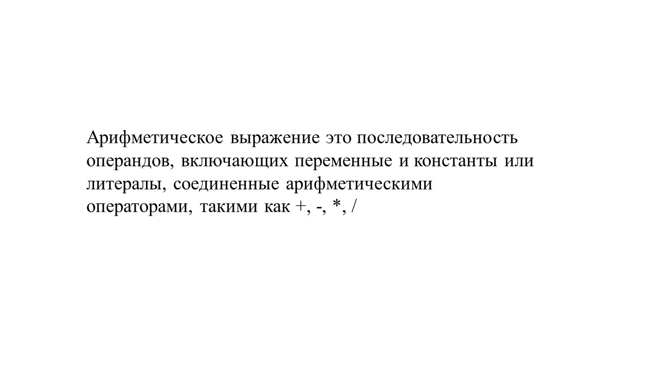 Арифметическое выражение это последовательность операндов, включающих переменные и константы или литералы, соединенные арифметическими операторами, такими как +, -, * & / .